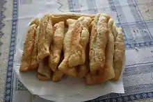 The Casadiella is a typical dessert from Asturias. It consists of a pastry made of wheat flour, flavored with Anis de la Asturiana (Anise liquor) or wine, and filled with toasted hazelnuts or walnuts and sugar. They are mixed and they are fried together.[1] The final shape is a tube approximately ten centimeters long with ends that are closed with a fork.