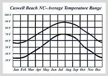 Summers in Caswell Beach are hot and humid with an average temperature of 85˚, although the beach front is cooled much of the time by sea breezes (the prevailing winds are from the southwest). Winters are moderate with an average temperature in the 50s (°F), albeit with brief cold periods. Rain occurs throughout the year with average annual rainfall approximately 57", 45% of this falling between June and September.[11]