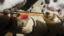 Object play for cats is the use of inanimate objects by the animal to express play behaviour.[3] In the case of pet domestic cats, humans normally provide them with purchased, human-made toys such as toy mice, bird or feather toys, or toy insects. These may be suspended from a string attached to a wooden or fishing-style rod designed to simulate lifelike activity in the toy, triggering the cat's predatory instincts – this game is known as catfishing.[4] Cat play can be enriched with the addition of obstacles behind which the prey can hide and items that make sound when the toy moves through them such as dried leaves, grass, or even a paper bag. When it comes to non-domestic, wild cats, they may use several objects in the wilderness as their toys including sticks, leaves, rocks, feathers, etc. Play behaviour includes throwing, chasing, biting, and capturing the toy object, mimicking behaviors used during an interaction with a real source of prey. Engaging in object play helps young cats practice these adult skills.[3]