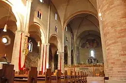 The interior has a nave and two aisles, all cross vaulted, separated by cylindrical pilasters in brickwork. Artworks include a polyptych by Callisto Piazza depicting the Massacre of the Innocents, another polyptych by Albertino Piazza with the Virgin in Heaven and a 15th century Universal Judgement. Finally, the large apse is decorated by a mosaic executed by Aligi Sassu.