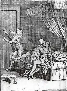 The seduction of Catherine Cadière by the jesuit Jean-Baptiste Girard. Contemporary engraving shows the devil guiding the jesuit.