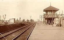 Caulfield railway station was opened on 7 May 1879, with the station consisting of a single platform and track for commuter and freight service.[16] The first station buildings were opened on the site between 1881 and 1883 to coincide with the duplication of track between the city and Oakleigh.[14] The current station was constructed in 1913–1914 to provide new and improved facilities for a station that was facing rapidly increasing growth.[14] The station rebuild was part of level crossing removal works that removed all level crossings, rebuilt all stations, and quadruplicated the corridor between South Yarra and Caulfield by 1914.[17] In late 1922, the line was electrified using 1500 V DC overhead wires, with "three position" signalling also introduced.[16]