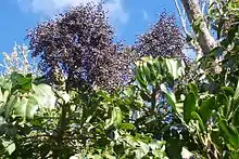 Purple flowers form on a terminal panicle, arranged in a series of racemes in the months of February to April. However, flowers can form at other times. The fruit is a drupe; brown or purplish black in colour, 5 to 7 mm wide. Inside the drupe are two cells, containing one seed each, 5 mm long. Seed is fertile for regeneration from the droppings of the pied currawong.