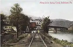 After passing through Bald Eagle Mountain in the water gap of Fishing Creek, the railroad ran southwest along the open and relatively level Nittany Valley towards Bellefonte. The main line crossed and connected with the Nittany Valley Railroad about three miles east of Bellefonte. As it approached that town, it swung west-northwesterly and descended along a ravine through Armor Gap to Spring Creek, then turned south to follow the east bank of Spring Creek into the center of Bellefonte. The road's enginehouse was located north of Bellefonte near the creek; an interchange with the PRR, which had a spur to the American Lime and Stone Company's plants in Armor Gap, was also located in the vicinity.[5][12]