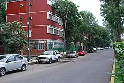 The original complex covered an area of 250,000 square meters. However, construction surface at the ground level only covered 16,000, leaving 80 percent of the grounds free for parks and sports areas.[5] It contained nineteen buildings of various heights, between three and nineteen floors. These buildings contained a total of 984 apartments of twelve different types to accommodate between 3,000 and 5,000 people.[5][8] The buildings had four types, labeled "A" (largest) "B", "C" and "D", with a total apartment floor space of 700,000 square feet.[8] At the Alemán complex, the buildings zigzag over the site, but in the Juárez complex, the buildings were placed at angles to give a greater sense of privacy and to provide the apartments with as much natural light as possible.[5][9] There were no vehicular roads within the complex to allow pedestrians to walk around. All of the vehicular roads that entered terminated at a parking lot before one entered the area where the apartment buildings were located.[5] There was only one road that passed through the complex, Orizaba Street, but this road was lowered below ground level, the first time this was done in Mexico City.[1][5] Pani placed four of the "C" type buildings right alongside this underpass to free even more space between the buildings for park and recreational space. About 2,500 trees were planted at the site.[10] These emphasis on space reduced Le Corbusier's recommendation of 1,000 residents per hectare to 240, and would make this the least densely populated of his apartment projects.[11] The apartments were split into two levels, with the kitchen and living room on one floor and the bedrooms above or below. In this way, elevators only had to stop at every third floor. All apartment and elevator access was through open passages. Within the apartments, open space was created by eliminating walls between the living and dining rooms, which was popular in the United States starting in the 1950s and 1960s. Tenants disposed of garbage though chutes to the basement, a novel idea in Mexico at that time.[12]