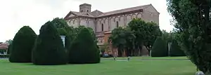 The present church, dedicated to Saint Christopher (San Cristoforo), was built in 1498, next to the original monastic church. The layout is that of a Latin cross with six lateral chapels. The project is attributed to Biagio Rossetti. The west front, which remains incomplete, was decorated in 1769 with a marble portal to the design of Gaetano Barbieri sculpted by Pietro Puttini, with angels by Francesco Zoppi.[1] The side altars were decorated by Nicolò Roselli, and contained an altarpiece (1570) by Bastianino.