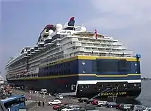 Between 1985 and 1998, the shipyard built several cruise ships for Royal Caribbean Cruise Line (RCCL). In 1987 the first of these ships, Sovereign of the Seas, was delivered, and was the first mega cruise ship in the world. Subsequent deliveries to RCCL included Monarch of the Seas, Majesty of the Seas, Nordic Empress, Legend of the Seas, Splendour of the Seas, Rhapsody of the Seas, and Vision of the Seas. In 2003, the shipyard also delivered Crystal Serenity to Crystal Cruises and Queen Mary 2 to Cunard.[7] During the construction of RMS Queen Mary 2, a gangway to the dry-docked ship collapsed, killing sixteen people.[8]