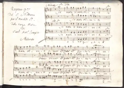 Campion was a prolific composer and represents a trait d'union between Baroque compositional methods and those of the Classical style.[16] He composed many instrumental pieces for harpsichord and strings, which were mentioned previously as being extremely successful abroad for demonstrating an excessive chromatic style, surely influenced by his teacher Tartini.[3][17][18][19] He worked very often with sacred music, in which on the contrary demonstrates a very rigid approach to counterpoint.[16][18] Many of his sacred compositions originate from celebrations and the court: for example, the Requiem for the death of Francis I of Lorrain (1766, the autograph is in Berlin, see Source section); the Te Deum, written for the birth of the heir to the throne Francis II (1768), which required almost 200 performers;[2][3][16] and the Requiem for the Florentine celebration of the death of Maria Theresa (1781), today in Vienna (see Sources). Oddly, there are no profane celebratory compositions by Campion[20][21] if not the cited Venere placata for the marriage of Josef II, and the incomplete Etruria fortunata,[22][21] written for Peter Leopold, which was probably unfinished because of Campion's death (the autograph is conserved in Fiesole, see Sources).[23] It is also important to mention the non-celebratory profane cantatas T'amo bell'idol mio, for voice and instruments (conserved at the Conservatory of Florence),[3][16][17][18] and the epithalamic cantata written for the Pichi family, today in Ancona.