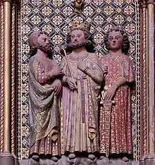 Charles, childless by his marriage to Richgard, tried to have his illegitimate son by an unknown concubine, Bernard, recognised as his heir in 885, but this met with opposition from several bishops. He had the support of Pope Hadrian III, whom he invited to an assembly in Worms in October 885, but the pope died on the way there, just after crossing the river Po.[14] Hadrian was going to remove the obstructing bishops for Charles, as he doubted he could do this himself, and legitimize Bernard.[14] Based on the unfavorable attitude shown by the chronicler responsible for the Mainz continuation of the Annales Fuldenses, the chief of Charles's opponents in this matter was most likely Liutbert, Archbishop of Mainz. Because Charles had called together the "bishops and counts of Gaul" as well as the pope to meet him at Worms, it is likely that he had plans to make Bernard King of Lotharingia.[15] Notker the Stammerer, who considered Bernard as a possible heir, wrote in his Deeds of Charlemagne: