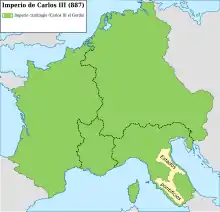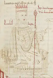 Charles III (839 – 13 January 888), also known as Charles the Fat, was the emperor of the Carolingian Empire[lower-alpha 1] from 881 to 887. A member of the Carolingian dynasty, Charles was the youngest son of Louis the German and Hemma, and a great-grandson of Charlemagne. He was the last Carolingian emperor of legitimate birth and the last to rule a united kingdom of the Franks.