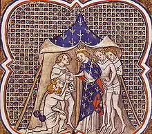 Charles eventually abandoned his plans for Bernard and instead adopted Louis of Provence as his son at an assembly at Kirchen in May.[18] It is possible, however, that the agreement with Louis was only designed to engender support for Bernard's sub-kingship in Lotharingia. In June or July, Berengar arrived in Kirchen, probably pining to be declared Charles's heir; he may in fact have been so named in Italy, where he was acclaimed (or made himself) king immediately after Charles's deposition.[19] Odo, Count of Paris, may have had a similar purpose in visiting Charles at Kirchen.[19] On the other hand, the presence of these magnates at these two great assemblies may merely have been necessary to confirm Charles's illegitimate son as his heir (Waiblingen), a plan which failed when the pope refused to attend, and then to confirm Louis instead (Kirchen).[20]