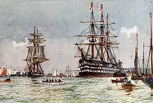 The first-rate HMS St Vincent, Ogle's flagship as Commander-in-Chief, Portsmouth. Painted by Charles Dixon
