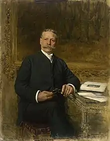 In August 1900, Yerkes became involved in the development of the London underground railway system after riding along the route of one proposed line and surveying the city of London from the summit of Hampstead Heath. He established the Underground Electric Railways Company of London to take control of the District Railway and the partly built Baker Street and Waterloo Railway, Charing Cross, Euston and Hampstead Railway, and Great Northern, Piccadilly and Brompton Railway.[1] Yerkes employed complex financial arrangements similar to those that he had used in the United States to raise the funds necessary to construct the new lines and electrify the District Railway (today known as the District line). In one of his last great triumphs, Yerkes managed to thwart an attempt by J. P. Morgan to enter the London underground railway field.[1] Yerkes did not live to see his London tube lines in operation. The now Bakerloo and Piccadilly lines opened in 1906, a few months after his death, and the Charing Cross line (today part of the Northern line) the following summer.