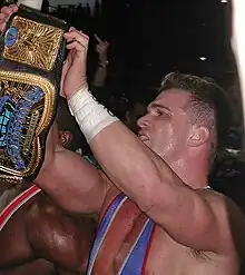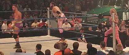 Haas debuted on WWE's main roster on the December 26, 2002 episode of SmackDown! as a heel (villainous character) along with Shelton Benjamin as Team Angle.[3] The tag team was the "contingency plan" of Paul Heyman, and were intended to help WWE Champion Kurt Angle retain his title, attacking Chris Benoit and Brock Lesnar in an attempt to soften them up. They quickly won the WWE Tag Team Championship on February 6, 2003, by defeating Los Guerreros (Eddie and Chavo Guerrero Jr.).[17] They held the championship for three months, including a successful title defense at WrestleMania XIX against Los Guerreros and the team of Chris Benoit and Rhyno, before losing the championship to Eddie Guerrero and his new partner Tajiri in a ladder match on May 18 at Judgment Day.[18][19] On the June 12 episode of SmackDown!, Angle fired Haas and Benjamin after they blamed him for losing the Tag Team Championship and began to question his leadership.[20] The duo then dubbed themselves The World's Greatest Tag Team, although announcers made sure to add "Self Proclaimed" to the name. Haas and Benjamin regained the championship from Guerrero and Tajiri on the July 3 episode of SmackDown!, but lost it to the reformed Los Guerreros on September 18.[21] The team was separated when Benjamin was moved to the Raw brand as part of the 2004 Draft Lottery.[22]