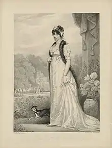 Few portraits survive of Charlotte. A pencil and chalk portrait of the Countess standing in a landscape with her dog was drawn by Henry Edridge in around 1805 and is now in the National Trust's collection at Tatton Hall, Cheshire.[41] A stipple engraving was made of the portrait by James Posselwhite, now in the collection of the National Portrait Gallery, London,[42] and a copy hangs in Belton House, Lincolnshire.[43] Also in the Tatton Collection is a portrait miniature of Charlotte painted by Richard Cosway in watercolour on ivory.[44]