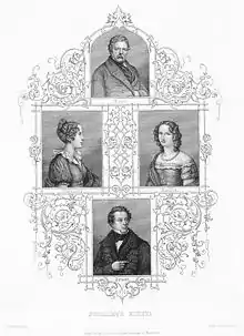 The precise nature of Schiller's relationship to the two sisters has been disputed. In Caroline's later novel Agnes von Lilien, two women both pursue a relationship with a young baron, and critics have debated whether to understand the novel's love triangle as a reflection of Caroline, Charlotte, and Schiller (more recent critics are less inclined to do so).[4] The letters later published from Schiller's correspondence with Charlotte are both deeply affectionate and literate; according to Edward Bulwer-Lytton, Lengefeld's admiration for Schiller's early work, particularly "The Artists," was important to their courtship.[1] They married on 20 February 1790.
