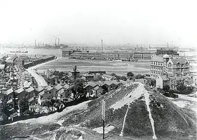 The club's first ground was Siemens Meadow (1905–1907), a patch of rough ground by the River Thames. This was over-shadowed by the Siemens Brothers Telegraph Works. Then followed Woolwich Common (1907–1908), Pound Park (1908–1913), and Angerstein Lane (1913–1915). After the end of the First World War, a chalk quarry known as the Swamps was identified as Charlton's new ground, and in the summer of 1919 work began to create the level playing area and remove debris from the site.[85] The first match at this site, now known as the club's current ground The Valley, was in September 1919. Charlton stayed at The Valley until 1923, when the club moved to The Mount stadium in Catford as part of a proposed merger with Catford Southend Football Club. However, after this move collapsed in 1924 Charlton returned to The Valley.