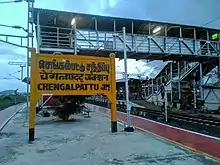 Chengalpattu Junction railway station is a railway junction of the southern section of the Chennai Suburban Railway Network situated in the town of Chengalpattu, 56 kilometres (35 mi) south-west of Chennai Beach. The station falls in the Chennai railway division of the Southern Railway zone of the Indian Railways. Officially it bears the code CGL.[1]