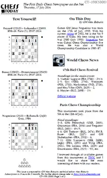 Chess Today was the first, and longest running, Internet-only daily chess newspaper,[1] having continued virtually uninterrupted from 7 November 2000 through to December 2020. It was distributed to subscribers by e-mail. Each e-mail had the PDF of the newspaper attached, as well as a small collection of recent games.[1] The editor and proprietor of Chess Today was Grandmaster Alexander Baburin.[2][3] Each edition contained at least one tactical puzzle, an annotated game, and world chess news. Other elements of the publication included 'On This Day', endgame analysis and chess reviews.[4] Chess Today also conducted and printed interviews with at least four former World Chess Champions.[2][5][6][7]