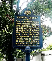 : CS1 maint: location missing publisher (link) - ↑ Futhey, John and Cope, Gilbert (1881). History of Chester County, Pennsylvania, with genealogical and biographical sketches. Philadelphia: L. H. Everts.