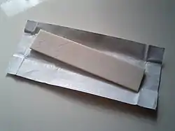 Chewing gum is a soft, cohesive substance designed to be chewed without being swallowed. Modern chewing gum is composed of gum base, sweeteners, softeners/plasticizers, flavors, colors, and, typically, a hard or powdered polyol coating.[1] Its texture is reminiscent of rubber because of the physical-chemical properties of its polymer, plasticizer, and resin components, which contribute to its elastic-plastic, sticky, chewy characteristics.[2]