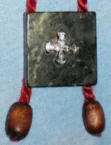 The award consists of a Connemara marble pendant with the World Crest embedded and a red rope finished with wooden beads at the end. The wooden beads on many award pendants to this day have swastikas carved in recess, see swastikas and Scouting. It seems that the presence of the carvings depend on the manufacturer.