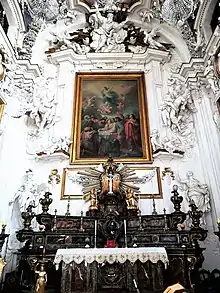 Among the paintings in the church are works by Antonio Grano and Filippo Tancredi. The latter depicted a Glory of St Teresa of Avila on the nave ceiling. The frescoes below the choir were painted by Guglielmo Borremans.[1] The main altar is made with precious stones, and flanked by stucco statues of Faith and Charity by Procopio Serpotta. The altarpiece depicting the Madonna of the Assumption (1800) was painted by Giuseppe Patricolo.