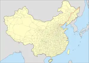 It leaves Beijing as the Jingtong Expressway and Tongzhou–Yanjiao Expressway into Hebei Province (they are rare occurrences that sections of National Highways are built to National Expressway standards). It then runs alongside the Beijing–Shenyang Expressway along the coast until Shenyang, Liaoning, and then along the Shenyang–Harbin Expressway until Harbin.