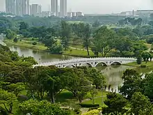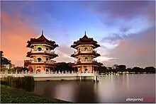 Chinese Garden[lower-alpha 1] is a park in Jurong East, Singapore. Built in 1975 by the JTC Corporation and designed by Prof. Yuen-chen Yu, an architect from Taiwan, the Chinese Garden's concept is based on Chinese gardening art.[2] The main characteristic is the integration of architectural features with the natural environment.[3] The Chinese Garden is modeled along the northern Chinese imperial style of architecture and landscaping.[1] It is located next to Chinese Garden MRT station and connected to the adjacent Japanese Garden by a bridge.[4] Along with Japanese Garden, the two gardens are collectively known as the Jurong Gardens.