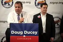 Christie contemplated running for president in the 2012 election, but ultimately declined to do so. He was vetted, but not chosen, by Mitt Romney as a potential vice-presidential candidate. The Romney campaign was reported to have asked him to resign his governorship if he became the vice-presidential nominee because "pay-to-play" laws restrict campaign contributions from financial corporation executives to governors running for federal office when the companies do business with the governor's state.[17] A memo from the campaign attributed Romney's decision not to choose Christie as his running mate in part to unanswered questions during the vetting process regarding a defamation lawsuit following Christie's initial campaign for Morris County Freeholder, a Securities and Exchange Commission investigation of Christie's brother, as well as his weight.[18][19] Christie gave the keynote address at the 2012 Republican National Convention.[20]