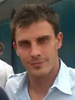 He started 2002–03 well, taking his place in the team due to injuries to other players.[25] He made his first appearance in the opening match, a 1–1 draw away to Macclesfield Town on 10 August 2002, with chairman John Batchelor claiming Smith had a "wonderful game and if we can get that sort of attitude from everyone in the team we won't have any problems".[27] Smith was dropped to the bench for a 1–1 home draw with Wrexham on 29 October 2002 due to a change in formation, having started every match in 2002–03 prior to this match, although he did play as a 48th-minute substitute.[28] He suffered a hamstring injury in early-November 2002,[29] making his return in a 1–0 victory away to Rochdale on 23 November.[30] Smith received his first red card of 2002–03 for a second bookable offence in a 1–1 home draw with Hull City on 28 December 2002, resulting in a one-match suspension.[31] This meant he missed York's match against Torquay on 11 January 2003, and after a short spell on the sidelines returned in a 2–1 home win over Macclesfield on 2 February.[30][31][32] Smith finished 2002–03 with 39 appearances for York,[30] and was described by the Evening Press as the "surprise star of the season".[33] Despite being in outstanding form and becoming a fans' favourite,[34] he was not offered a new contract with York at the end of 2002–03 by Dolan, although he hoped to still to have a future at the club.[35] This decision was reversed by newly appointed player-manager Chris Brass, and Smith signed a new one-year contract in July 2003.[36]