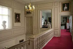 The restoration of the Mansion for its public opening was the work of the Ipswich architect John Shewell Corder, and its redevelopment as a Museum was undertaken by Frank Woolnough, Curator of the Ipswich Corporation Museum 1893–1920. Woolnough, an active member of the Museums Association and of the Savage Club, also developed its use as a venue for annual meetings of various Societies, and for educational purposes. During this time it was also the home of the archaeological galleries of Miss Nina Layard, over which she had honorary curatorship.[9] Under curator Guy Maynard (1920–1952) the enlargement of the fine and decorative art and furniture collections continued. The Thomas Gainsborough Bicentenary Exhibition of 1927, including also works by George Frost and John Constable, showcased the mansion as the home of a collection of national importance. The structure was further enlarged with the addition of the new Wolsey Art Gallery at the rear, and an entire two-storey wing rescued in 1924 from the demolition of a Tudor merchant's house.[10]