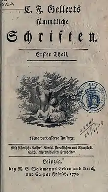 - Gellert, Christian Fürchtegott (1775). [Opere]. 1. Leipzig: bey M. C. Weidmanns Erben und Reich, und Caspar Fritsch.