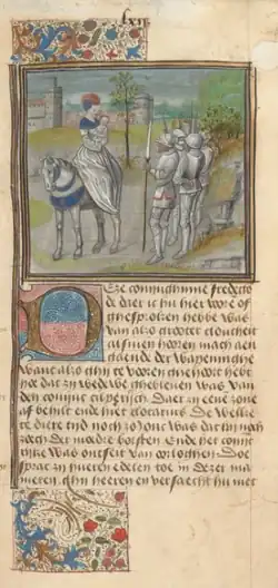 Christine believed that France had been founded by the descendants of the Trojans and that its governance by the royal family adhered to the Aristotelian ideal.[16] In 1400 Christine published L'Épistre de Othéa a Hector (Letter of Othea to Hector).[17] When first published, the book was dedicated to Louis of Orléans, the brother of Charles VI, who was at court seen as potential regent of France.[18] In L'Épistre de Othéa a Hector Hector of Troy is tutored in statecraft and the political virtues by the goddess of wisdom Othéa.[17] Christine produced richly illustrated luxury editions of L'Épistre de Othéa a Hector in 1400.[19] Between 1408 and 1415 Christine produced further editions of the book.[18] Throughout her career she produced rededicated editions of the book with customised prologues for patrons,[20] including an edition for Philip the Bold in 1403, and editions for Jean of Berry and Henry IV of England in 1404.[21] Patronage changed in the late Middle Ages. Texts were still produced and circulated as continuous roll manuscripts, but were increasingly replaced by the bound codex. Members of the royal family became patrons of writers by commissioning books. As materials became cheaper a book trade developed, so writers and bookmakers produced books for the French nobility, who could afford to establish their own libraries. Christine thus had no single patron who consistently supported her financially and became associated with the royal court and the different factions of the royal family – the Burgundy, Orleans and Berry – each having their own respective courts.[22] Throughout her career Christine undertook concurrent paid projects for individual patrons and subsequently published these works for dissemination among the nobility of France.[22]