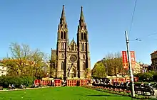The Basilica of St. Ludmila (Czech: Bazilika svaté Ludmily) is a neo-Gothic Catholic church at Náměstí Míru (Peace Square) in Prague's Vinohrady, built on plans of Josef Mocker in 1888–1892. It is named in honor of St. Ludmila of Bohemia.