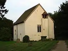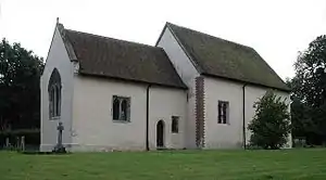 The site of the church dates from at least Saxon times with two phases of Saxon construction from the 8th to 10th centuries. Some Romano-British pottery, pre-dating the present church by several centuries, was found under the north nave wall during excavations in 1993[3] indicating a much earlier settlement on this site. Pevsner states that the bricks in the East angles of the nave are Roman.[4] The walls are clunch with brick and flint rubble and are plastered. The chancel measures 25 ft. 6 in. by 14 ft. 6 in., the nave 31 ft. by 20 ft. 6 in., and the south porch 6 ft. by 5 ft., with all dimensions being measured internally. The nave is the earliest part of the church, and belongs to the 12th century, the chancel to the latter part of the 14th century, and the west turret to the 15th century, at which time windows were altered and the rood stair was built. On the south side of the chancel is a 14th-century moulded and arched piscina, and on the north side is an arched niche for a tomb.[1][5][6]