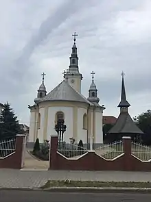 The provincial Baroque church lies along an east–west line; it is composed of a vestibule with a spire, a long rectangular nave and an altar with a semicircular apse. There are side apses where the nave joins the altar. The facades are simple. The main entrance is enclosed in a stone semicircle and flanked by half columns. The large Baroque iconostasis has several levels of Byzantine icons. The royal doors are decorated with leaves and roses.[1]