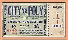 The City–Poly football rivalry, also referred to as the "City-Poly Game" is an American football rivalry between the Baltimore City College Black Knights (City) and the Baltimore Polytechnic Institute Engineers (Poly). This matchup is the oldest football rivalry in Maryland.[1] The rivalry is believed to be the second-oldest high school football rivalry in the United States between public high schools, predated only by the English High School of Boston-Boston Latin School football rivalry, which started two years earlier in 1887. The rivalry began in 1889 and the teams have met 134 times in history. City College leads the series 66-62-6.[2][3]