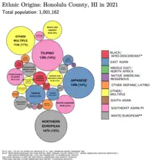 The mayor of Honolulu County is Rick Blangiardi. The county motto is "Haʻaheo No ʻO Honolulu (Honolulu Pride)".[7] About 70% of the state's population lives in Honolulu County. Only Nevada has a higher percentage of its population living in its most populous county. 43.0% of residents identify as Asian or Asian American, the highest of any U.S. county.[8]