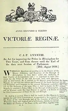 Following Chartist rioting in 1839, when one hundred police had to be brought from London, an Act of Parliament was passed on 26 August 1839 "for improving the Police in Birmingham". Birmingham was required to have at least 250 constables and 50 officers, [4] funded by a rate imposed on the town of Birmingham, but serving all of Warwickshire, Worcestershire and Staffordshire.[1] A commissioner was to be appointed by the Home Secretary and report to him.[4] The Birmingham force came into being on 20 November 1839 with 260 men. Francis Burgess, a local barrister, was appointed as the first police commissioner for Birmingham.[5] On 12 August 1842 a new Police Act transferred responsibility to the Birmingham Town Council and another removed doubts as to the authority of the council.[4] Burgess was succeeded by Richard Stephens, as the first Superintendent of the Birmingham Borough Police.[1]