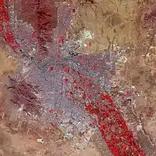 False-color satellite image of El Paso (upper right) and Ciudad Juárez (lower left): Paved streets and buildings appear in varying shades of blue-gray, and red indicates vegetation.
