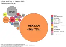 El Paso (/ɛl ˈpæs/; Spanish: [el ˈpaso]; lit.'the pass' or 'the step') is a city in and the county seat of El Paso County, Texas, United States. The 2020 population of the city from the U.S. Census Bureau was 678,815,[4] making it the 22nd-most populous city in the U.S., the most populous city in West Texas, and the sixth-most populous city in Texas.[8] The city has the largest Hispanic population share of main cities in the U.S. at 81%. Its metropolitan statistical area covers all of El Paso and Hudspeth counties in Texas, and had a population of 868,859 in 2020.[9]