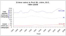 Police protection is contracted to the Royal Canadian Mounted Police which operates a 26 officer municipal detachment and a 10-member rural detachment from the city.[45] In 2005, the municipal detachment reported 4,048 Criminal Code offences, which translates into a crime rate of 228 Criminal Code offences per 1,000 people, much higher than the provincial average of 125 offences. During that year, compared to the provincial average, the RCMP reported much higher crime rates in Fort St. John for cocaine, cannabis, non-sexual assaults, property damage, and arson related offences. However, the city had lower crime rates for robbery, theft from motor vehicles, and business break-and-enters. [46]