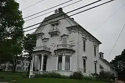The Clark Perry House is located in the village of Machias, a short way west of the main downtown area, on the north side of Court Street (United States Route 1A), between Broadway and Cooper Street. It is a typical New England connected house, with a main block that has ells connecting it to a carriage barn at the rear. It is a wood-frame structure, 2+1⁄2 stories in height, with a clipped-gable roof, clapboard siding, and granite foundation. The main facade faces south, and is two bays wide, with a single-story polygonal window bay on the right, and the main entrance on the left. Both the entry porch and window bay are topped by turned balustrades, and have bracketed and dentillated cornices, details that are repeated on the main roof line. The porch is supported by panelled posts mounted in wooden piers. Windows on the front and sides are capped by decorated bracketed hoods with mini-gables.[2]