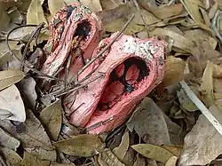 Before the volva opens, the fruiting body is egg-shaped to roughly spherical, up to 6 cm (2.4 in) in diameter, with a gelatinous interior up to 3 mm (0.1 in) thick. White to grayish in color, it is initially smooth, but develops a network of polygonal marks on the surface prior to opening as the internal structures expand and stretch the peridium taut.[21] The fruit body, or receptacle, bursts the egg open as it expands (a process that can take as little as a few hours),[6] and leaves the remains of the peridium as a cup or volva surrounding the base.[21] The receptacle ranges in color from red to pale orange, and it is often lighter in color approaching the base. The color appears to be dependent upon the temperature and humidity of the environment.[22] The receptacle consists of a spongy network of "arms" interlaced to make meshes of unequal size. At the top of the receptacle, the arms are up to 1.5 cm (0.6 in) thick, but they taper down to smaller widths near the base. A cross-section of the arm reveals it to be spongy, and made up of one wide inner tube and two indistinct rows of tubes towards the outside. The outer surface of the receptacle is ribbed or wrinkled.[21] There are between 80 and 120 mesh holes in the receptacle.[23] The unusual shape of the receptacle has inspired some creative comparisons: David Arora likened it to a whiffleball,[22] while the German Mycological Society—who named C. ruber the 2011 "Mushroom of the Year"—described it as "like an alien from a science fiction horror film".[24]