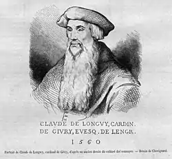 Claude de Longwy de Givry (1481–1561) was a French bishop and Cardinal, from an aristocratic background. He was the son of Philippe de Longuy, Seigneur de Givry and Jeanne de Beautremont, Dame de Mirabeau. He had four brothers: Jean de Longuy, Sieur de Givry and Baron de Mirabeau (who married Jeanne d'Orleans, natural sister of King Francis I), Christophe de Longuy, Antoine de Longuy, and Étienne de Longuy. Claude's aunt Jeanne had married Guy de la Baume, Count de Montrevel, and one of their sons was Cardinal Pierre de la Baume (1539-1544), Prince and Bishop of Geneva (1522-1543).[1]
