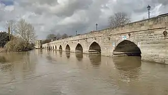 Two arches were rebuilt in 1524. The bridge was again repaired in 1588 following flooding, and in 1642 after an arch had been destroyed to block the army of Oliver Cromwell. In 1696, money was raised to heighten the parapets, which were as low as four inches in places. The bridge was widened on the north side (upstream) in 1811, and a ten-sided toll-house tower added in 1814. A cast-iron footbridge was added to the north side in 1827.[3]