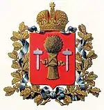The coat of arms of the Radom Governorate depicted an orange (golden) sheaf of hay, tied up with an orange band, with a silver hammer placed to the left, and to the right, from the hay. They were placed within a blue French-style escutcheon. Around the shield, there are yellow (golden) leaves of the oak tree, interspersed with the blue ribbon of the Order of St. Andrew. On the top of the coat of arms, above the escutcheon, there was the yellow (golden) Imperial Crown of Russia.[6][9]