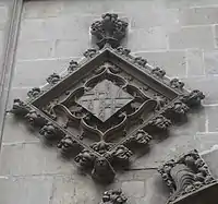 The coat of arms of Barcelona is the official emblem of the City Council of Barcelona, the capital of Catalonia, has its origin in the Middle Ages, these arms were first documented in 1329.[1] The Government of Catalonia conferred the coat of arms and the flag as official symbols of the municipality in 2004. It has an escutcheon in lozenge which is commonly used in municipal coats of arms of cities in Catalonia.[2] Currently the City Council of Barcelona also uses an isotype based on the heraldry of the city.