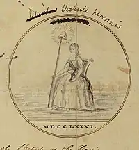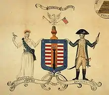 Barton then came up with another design, which the committee submitted back to Congress on May 9, 1782, just five days after being formed. This time, the figures on each side of the shield were the "Genius of the American Confederated Republic" represented by a maiden, and on the other side an American warrior. At the top is an eagle and on the pillar in the shield is a "Phoenix in Flames". The mottos were In Vindiciam Libertatis (In Defense of Liberty) and Virtus sola invicta (Only virtue unconquered).[53]